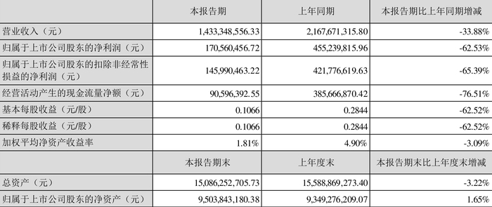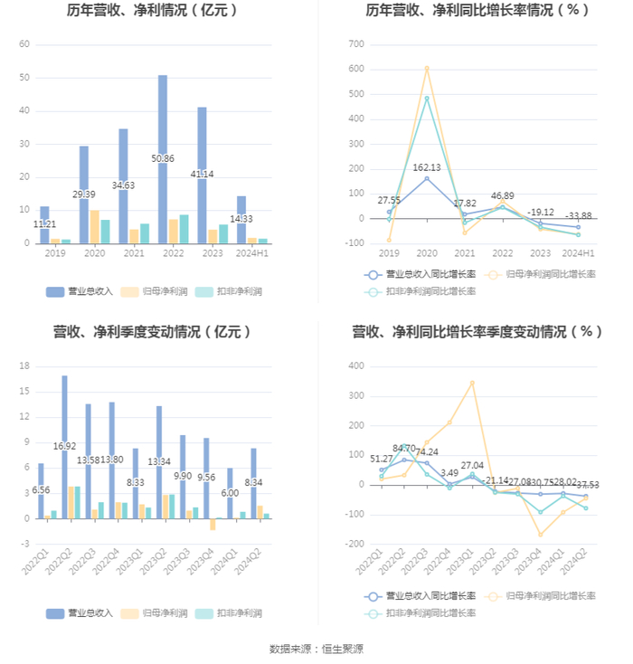 根据半年报,公司第二季度实现营业总收入8.34亿元,同比下降37.53%,环比增长38.99%;归母净利润1.56亿元,同比下降44.77%,环比增长1007.29%;扣非净利润6195.66万元,同比下降78.46%,环比下降26.27%。