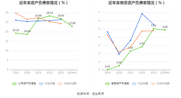 在偿债能力方面,公司2024年上半年末资产负债率为22.86%,相比上年末下降4.04个百分点;有息资产负债率为4.89%,相比上年末下降0.15个百分点。