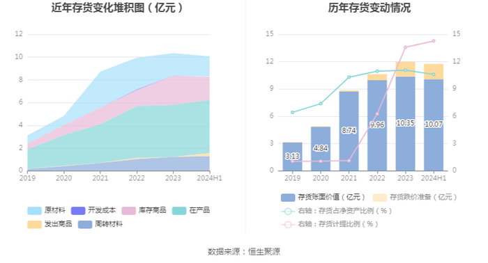 从存货变动来看,截至2024年上半年末,公司存货账面价值为10.07亿元,占净资产的10.6%,较上年末减少2759.39万元。其中,存货跌价准备为1.68亿元,计提比例为14.28%。