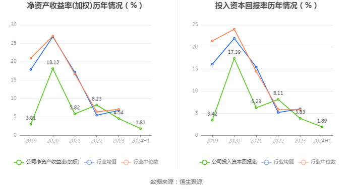 数据显示,2024年上半年公司加权平均净资产收益率为1.81%,较上年同期下降3.09个百分点;公司2024年上半年投入资本回报率为1.89%,较上年同期下降2.65个百分点。