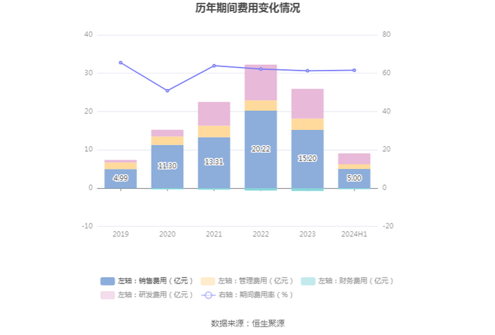 2024年上半年,公司期间费用为8.83亿元,较上年同期减少3.51亿元;但期间费用率为61.57%,较上年同期上升4.65个百分点。其中,销售费用同比下降36.12%,管理费用同比增长1.88%,研发费用同比下降21.42%,财务费用由去年同期的-3526.25万元变为-2776.53万元。