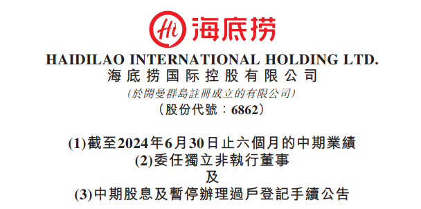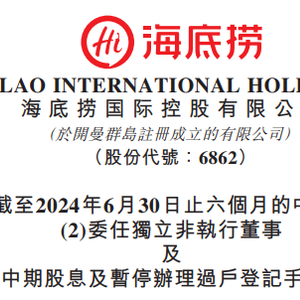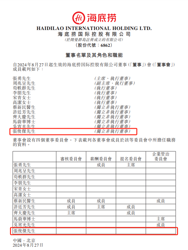 8月28日,海底捞(06862.HK)公告,委任张俊杰为独立非执行董事,自2024年8月27日起生效。张俊杰已与海底捞订立委任函,为期三年。张俊杰有权收取年度薪酬人民币120万元。海底捞董事会辖下的薪酬委员会及董事会将不时参考现行市场水平及张俊杰的职责职责及表现而对其薪酬进行年度审核。