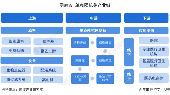 随着杂交瘤技术的出现,单克隆抗体的应用日趋广泛,抗体药物在现代医学中发挥着越来越重要的作用。目前,单抗药物已是全球制药领域中增长最快的细分领域之一。从产业链来看,单克隆抗体产业链一般包括上游的细胞原料、培养基等原料,生物反应器、膜系统等设备,中游的单克隆抗体研发及制药、下游单克隆抗体应用等方面。其产业链如下图所示: