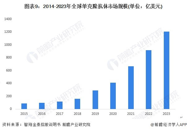 随着中国患者基数的不断增长、新型单抗药物的推出、抗体药物渗透率的提高,中国单克隆抗体药物市场不断快速增长。根据智翔金泰招股说明书,2018年中国单抗市场规模达到160亿元,2016年至2020年的复合增长率为43.2%。2023年,中国单抗市场规模超过1200亿元。