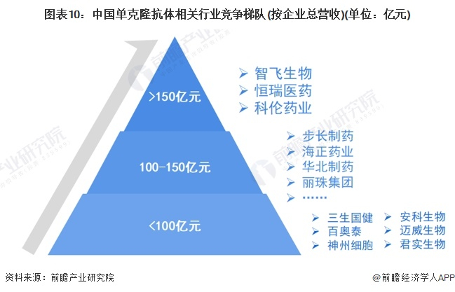 我国单克隆抗体行业上市公司主要有神州细胞、华兰生物、君实生物等企业。按照单克隆抗体企业整体营收来看,智飞生物、恒瑞医药、科伦药业总营收处于第一梯队,其中智飞生物营收达529.18亿元。步长制药、海正药业、华北制药、丽珠集团营收在100-150亿元之间,处于第二梯队;三生国健、百奥泰、神州细胞等在总营收方面处于第三梯队。