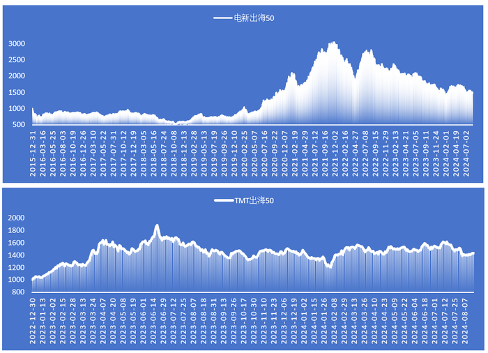 数据显示,截至2024年8月23日,电新出海50、TMT出海50自基期以来累计回报分别为45.58%、42.50%,年化收益率4.57%、24.84%,夏普比率0.08、0.72,展现出在一定风险条件下的超额回报能力。