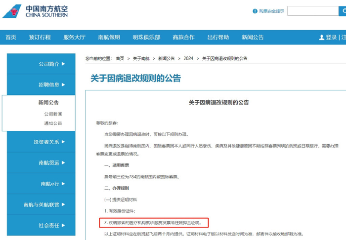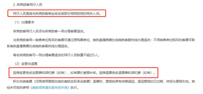 记者了解到,今年1月,南方航空调整客票退改规则,放宽了因病退改规则。2月9日,南方航空发布的《关于因病退改规则的公告》明确,医疗证明材料为就诊缴费发票或住院押金证明。同行人员则是指与疾病旅客乘坐完全或部分相同航班的相关人员,同行人员须与疾病旅客一同办理客票退改。