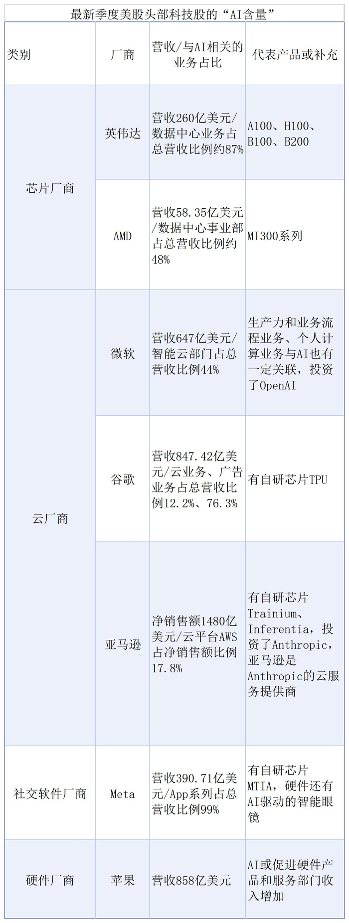 微软、谷歌、亚马逊可划为云厂商阵列。从云业务占比看,微软与AI的关联可能是最强的,谷歌和亚马逊的云业务营收占比偏低。云业务之外,这几家厂商其实另有“主业”,虽然部分业务也与AI有一定关联,但AI具体拉动了多少收入增长仍是疑问。