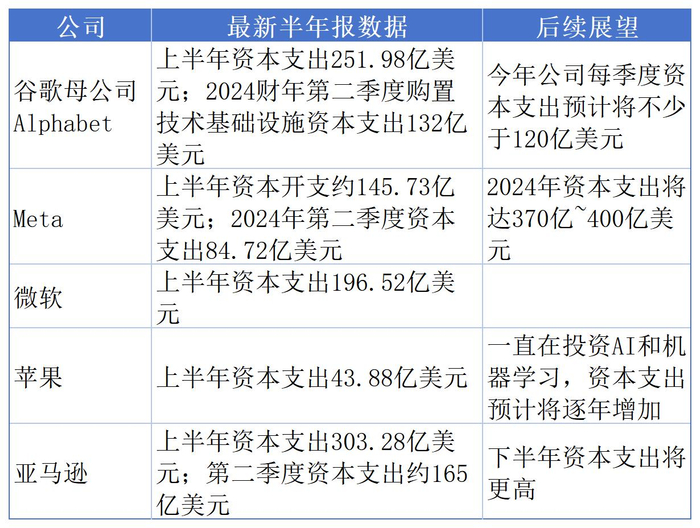 从资本支出来看,谷歌母公司Alphabet在2024财年第二季度购置技术基础设施资本支出达132亿美元,这笔支出预计高于去年,今年公司每季度资本支出预计将不少于120亿美元;Meta预计2024年资本支出将达370亿~400亿美元,明年资本支出还将大幅增长;微软最新季度的资本支出达196.52亿美元;苹果称公司一直在投资AI和机器学习,资本支出预计将逐年增加。亚马逊今年上半年资本支出305亿美元且预计下半年这笔支出还会更高。今年上半年,微软、谷歌、亚马逊和Meta资本支出增加了50%,总额超过千亿美元,达历史新高。