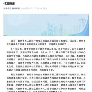 对此,8月27日,廊坊市卫生健康委员会发布情况通报称,近日,霸州市第二医院一患者反映优先用血问题引发社会广泛关注。该委立即成立调查组开展核实调查,现将情况通报如下: