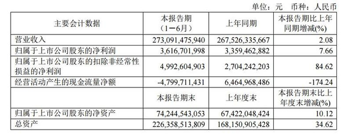 江西铜业8月28日晚间发布了半年报显示:上半年,公司实现营业收入2,730.91亿元,同比增长2.08%,(上年同期2,675.26亿元);归属于上市公司股东净利润36.17亿元,同比增长7.66%(上年同期33.59亿元)。截至2024年6月30日,公司总资产为2,263.59亿元,较年初增长34.62%(年初:1,681.51亿元),其中,归属于上市公司股东净资产为742.45亿元,较年初增长10.12%(年初:674.22亿元)。营业收入变动原因主要是主产品销量及价格变动所致。