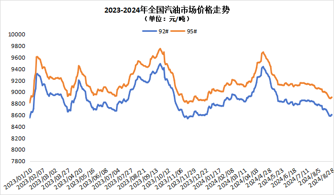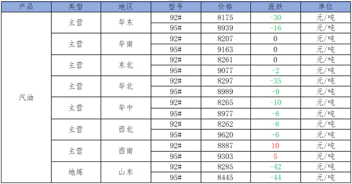 汽油:今日主营汽油价格弱势小跌。预计后期原油价格或震荡盘整,零售限价指向不明,消息面对市场暂无指引。月底最后几天,主营单位销售任务基本完成,市场成交中优惠小许。随着学生开学来临,居民外出计划减少,汽油需求有所减弱,市场多刚需小单采购。