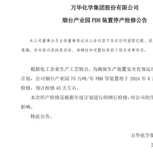 8月22日,万华化学发布公告表示,根据化工企业生产工艺特点,为确保生产装置安全有效运行,按照年度检修计划,公司烟台产业园园75万吨/年PDH等装置将于2024年8月25日开始停产检修,预计检修45天左右。本次停产检修是根据年度计划进行的例行检修,对公司的生产经营不会产生影响。