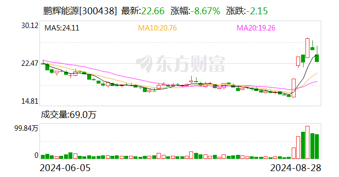值得注意的是,鹏辉能源28日低开3.06%,开盘后公司股价继续走低,尾盘一度拉红,截至收盘,鹏辉能源跌8.67%,报22.66元/股。
