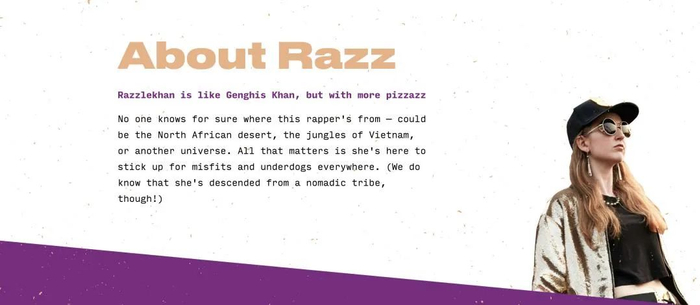 她声称自己于2018年陷入了严重的职业倦怠,于是决定从事说唱事业,并给自己取了个艺名,叫Razzlekhan,称这个名字“就像成吉思汗,但更有活力”。