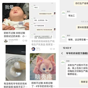 “我咨询了‘爷爷的农场’官方旗舰店客服,他说该产品的生产线也生产乳制品,但在生产米粉时会做产线清洁和过敏原验证。对此我很怀疑,就配料表的现有成分,米粉中如果没有混入乳制品成分,宝宝不可能会过敏。”在小红书上,一位消费者发帖表示。
