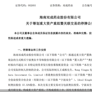 因有关事项尚存在不确定性,为了维护投资者利益,避免对公司证券交易造成重大影响,根据深交所的相关规定,经双成药业申请,公司证券自8月28日开市起开始停牌。双成药业表示,公司预计在不超过5个交易日的时间内披露本次交易方案。
