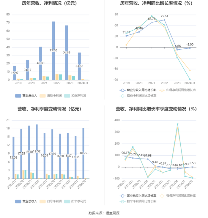 根据半年报,公司第二季度实现营业总收入18.25亿元,同比增长2.58%,环比增长18.81%;归母净利润1798.46万元,同比下降88.35%,环比下降82.31%;扣非净利润944.49万元,同比下降94.25%,环比下降61.54%。