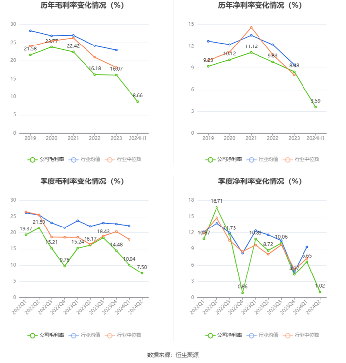 2024年上半年,公司毛利率为8.66%,同比下降7.06个百分点;净利率为3.59%,较上年同期下降6.15个百分点。从单季度指标来看,2024年第二季度公司毛利率为7.50%,同比下降8.67个百分点,环比下降2.54个百分点;净利率为1.02%,较上年同期下降7.70个百分点,较上一季度下降5.63个百分点。