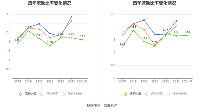 2024年上半年,公司流动比率为2.11,速动比率为1.68。