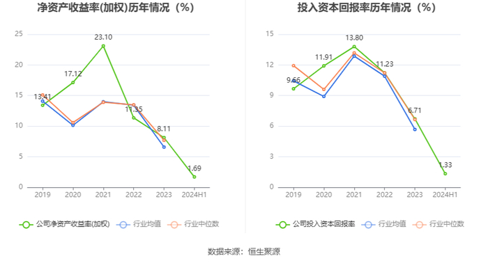数据显示,2024年上半年公司加权平均净资产收益率为1.69%,较上年同期下降3.09个百分点;公司2024年上半年投入资本回报率为1.33%,较上年同期下降2.62个百分点。