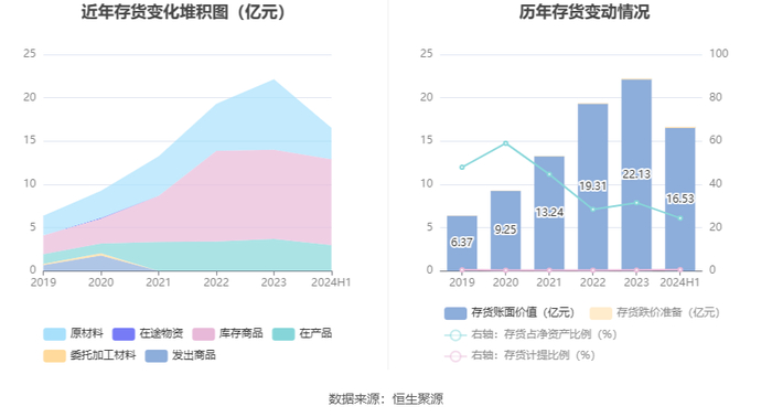 从存货变动来看,截至2024年上半年末,公司存货账面价值为16.53亿元,占净资产的24.39%,较上年末减少5.6亿元。其中,存货跌价准备为999.06万元,计提比例为0.6%。