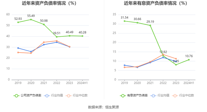 在偿债能力方面,公司2024年上半年末资产负债率为40.28%,相比上年末下降0.21个百分点;有息资产负债率为10.76%,相比上年末上升2.71个百分点。