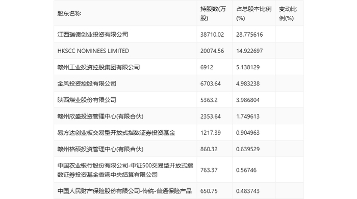 半年报显示,2024年上半年末公司十大流通股东中,新进股东为中国农业银行股份有限公司-中证500交易型开放式指数证券投资基金香港中央结算有限公司、中国人民财产保险股份有限公司-传统-普通保险产品,取代了一季度末的香港中央结算有限公司、全国社保基金一零四组合。在具体持股比例上,江西瑞德创业投资有限公司、HKSCC NOMINEES LIMITED、赣州工业投资控股集团有限公司、金风投资控股有限公司、陕西煤业股份有限公司、赣州欣盛投资管理中心(有限合伙)、易方达创业板交易型开放式指数证券投资基金、赣州格硕投资管理中心(有限合伙)持股有所下降。