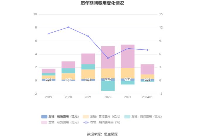 2024年上半年,公司期间费用为2.34亿元,较上年同期增加2827.82万元;期间费用率为6.96%,较上年同期上升0.97个百分点。其中,销售费用同比增长142.99%,管理费用同比增长17.16%,研发费用同比下降12.54%,财务费用由去年同期的-3868.11万元变为-1367.59万元。