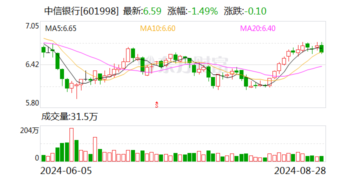 中信银行:上半年归母净利润354.9亿元 同比下降1.6% 拟10派1.847元
