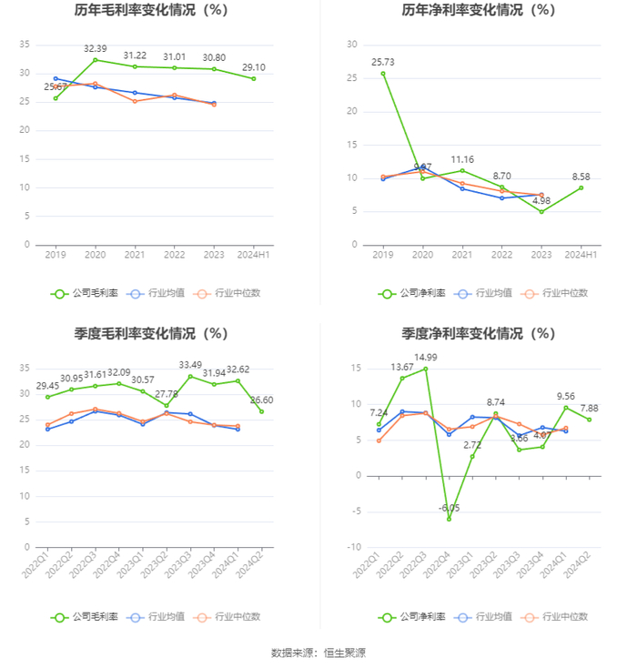 2024年上半年,公司毛利率为29.10%,同比上升0.07个百分点;净利率为8.58%,较上年同期上升2.55个百分点。从单季度指标来看,2024年第二季度公司毛利率为26.60%,同比下降1.18个百分点,环比下降6.02个百分点;净利率为7.88%,较上年同期下降0.86个百分点,较上一季度下降1.68个百分点。