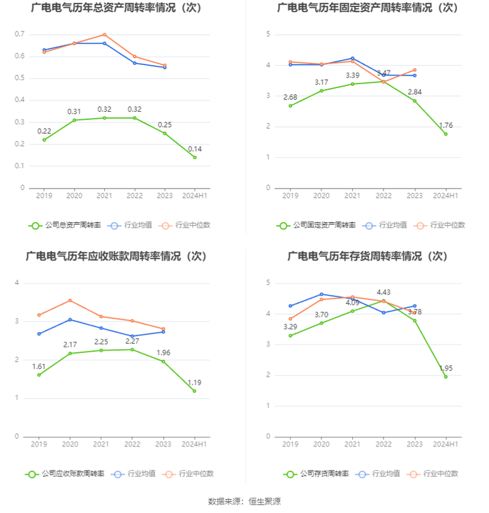 营运能力方面,2024年上半年,公司总资产周转率为0.14次,上年同期为0.13次(2023年上半年行业平均值为0.25次,公司位居同行业20/25);固定资产周转率为1.76次,上年同期为1.43次(2023年上半年行业平均值为1.90次,公司位居同行业16/25);公司应收账款周转率、存货周转率分别为1.19次、1.95次。