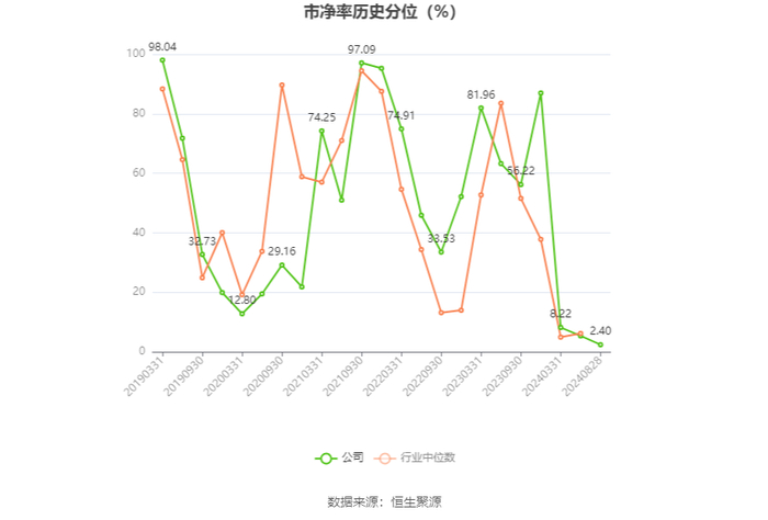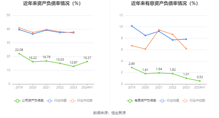 在偿债能力方面,公司2024年上半年末资产负债率为16.37%,相比上年末上升3.50个百分点;有息资产负债率为0.53%,相比上年末下降0.48个百分点。