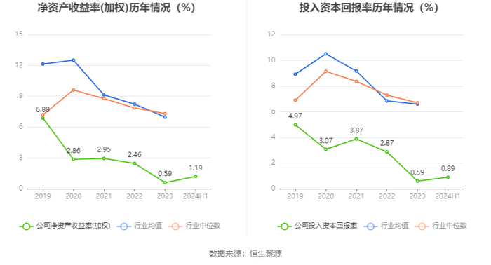 数据显示,2024年上半年公司加权平均净资产收益率为1.19%,较上年同期增长0.54个百分点;公司2024年上半年投入资本回报率为0.89%,较上年同期增长0.39个百分点。