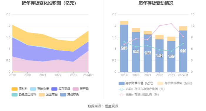 从存货变动来看,截至2024年上半年末,公司存货账面价值为1.81亿元,占净资产的7.44%,较上年末增加4666.39万元。其中,存货跌价准备为1849.72万元,计提比例为9.26%。