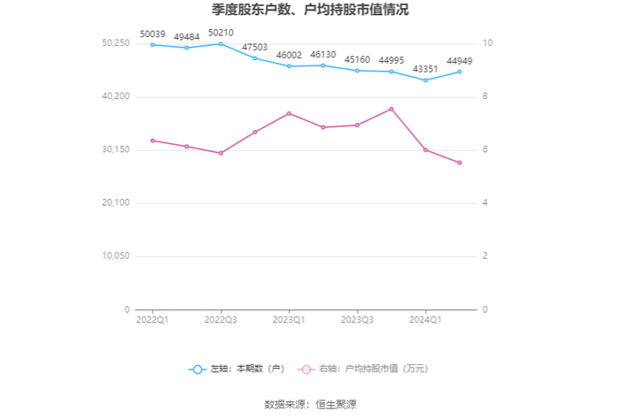 筹码集中度方面,截至2024年上半年末,公司股东总户数为4.49万户,较一季度末增长了1598户,增幅3.69%;户均持股市值由一季度末的6.01万元下降至5.53万元,降幅为7.99%。