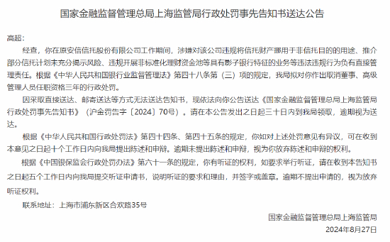 8月28日金融一线消息,国家金融监督管理总局上海监管局行政处罚事先告知书送达公告显示,高超在原安信信托股份有限公司工作期间,涉嫌对该公司违规将信托财产挪用于非信托目的的用途、推介部分信托计划未充分揭示风险、违规开展非标准化理财资金池等具有影子银行特征的业务等违法违规行为负有直接管理责任。