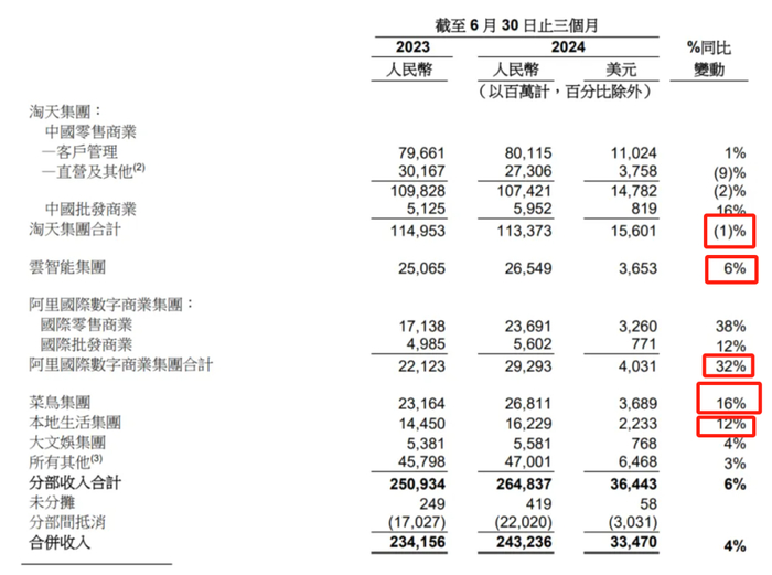其中,阿里云公共云收入双位数增长,AI相关产品收入三位数增长,经调整EBITA同比增长155%;阿里国际数字商业集团收入同比增长32%;菜鸟季度收入同比增长16%。