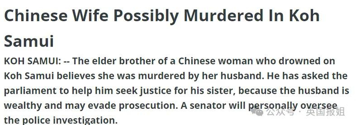 帖子内容讲述自家一个长相美貌的妹妹,和相识十几年的富豪老公前往泰国苏梅岛度假后,在自家豪宅内离奇死亡。男方称妹妹是酒后失足落水溺亡,但尸检报告显示是她被勒死后抛入泳池的。