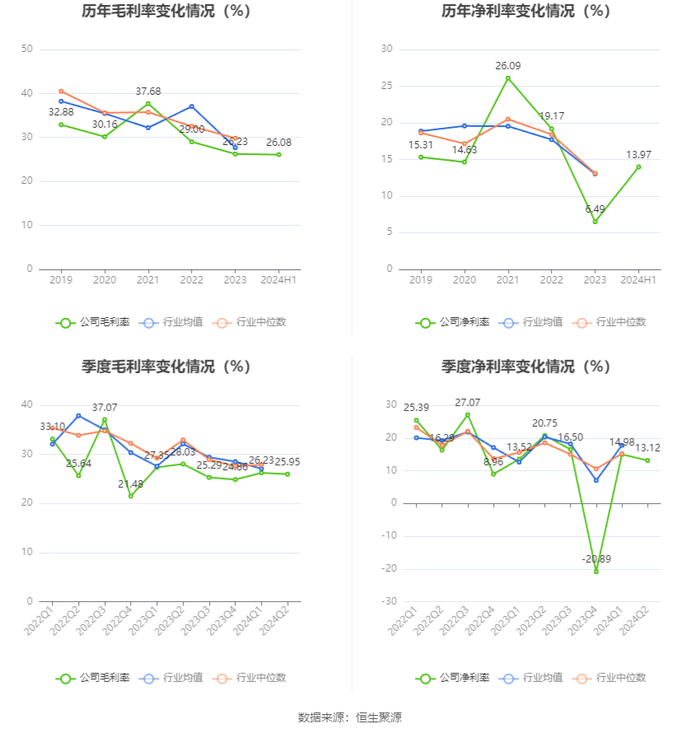 2024年上半年,公司毛利率为26.08%,同比下降1.65个百分点;净利率为13.97%,较上年同期下降3.66个百分点。从单季度指标来看,2024年第二季度公司毛利率为25.95%,同比下降2.08个百分点,环比下降0.28个百分点;净利率为13.12%,较上年同期下降7.63个百分点,较上一季度下降1.86个百分点。