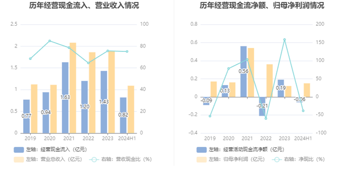 2024年上半年,公司营业收入现金比为75.13%,净现比为-38.43%。