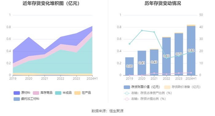 从存货变动来看,截至2024年上半年末,公司存货账面价值为8225.49万元,占净资产的19.29%,较上年末增加1195.81万元。其中,存货跌价准备为178.96万元,计提比例为2.13%。
