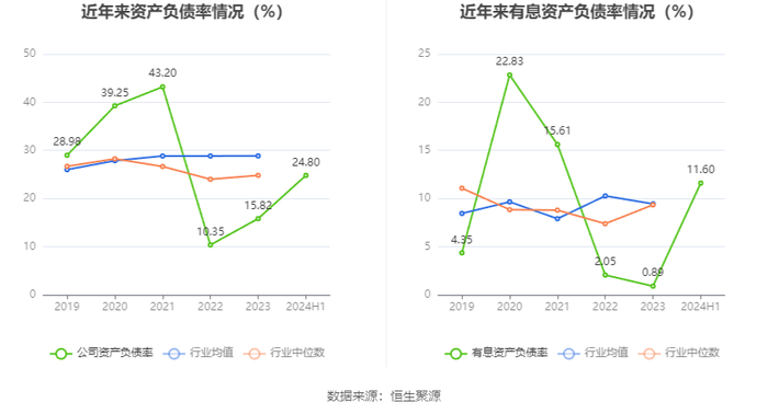 在偿债能力方面,公司2024年上半年末资产负债率为24.80%,相比上年末上升8.98个百分点;有息资产负债率为11.60%,相比上年末上升10.71个百分点。