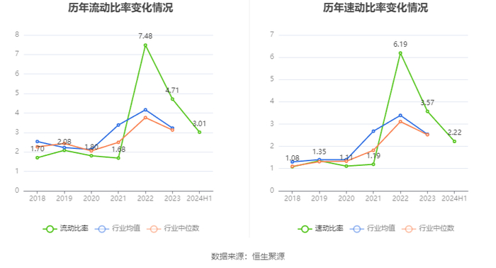 2024年上半年,公司流动比率为3.01,速动比率为2.22。