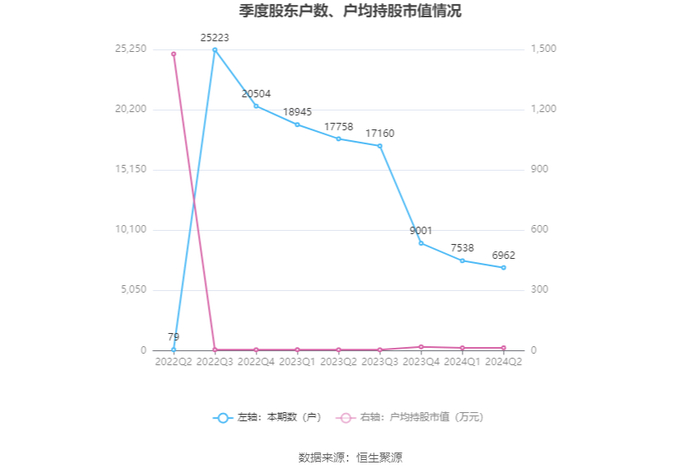 筹码集中度方面,截至2024年上半年末,公司股东总户数为6962户,较一季度末下降了576户,降幅7.64%;户均持股市值由一季度末的13.84万元上升至14.26万元,增幅为3.03%。