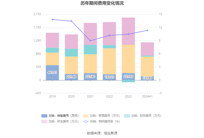 2024年上半年,公司期间费用为1236.44万元,较上年同期增加351.55万元;期间费用率为11.37%,较上年同期上升0.54个百分点。其中,销售费用同比增长0.48%,管理费用同比增长57.2%,研发费用同比增长10.64%,财务费用由去年同期的-45.97万元变为28.07万元。