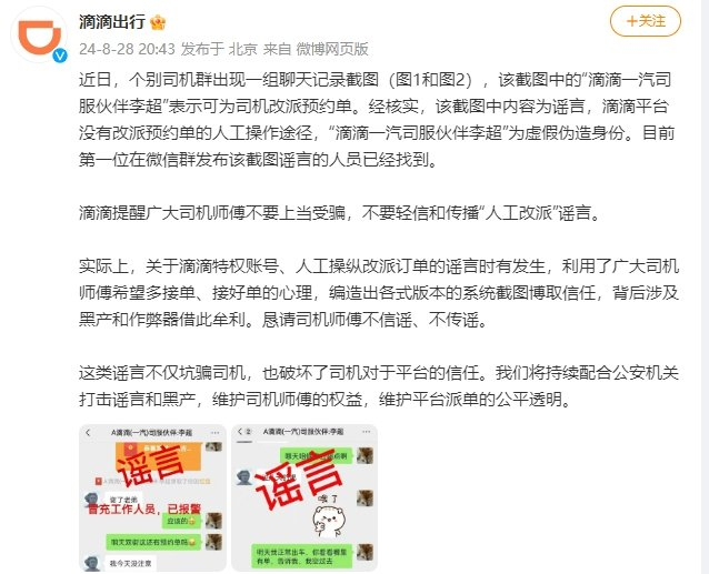 这类谣言不仅坑骗司机,也破坏了司机对于平台的信任。我们将持续配合公安机关打击谣言和黑产,维护司机师傅的权益,维护平台派单的公平透明。