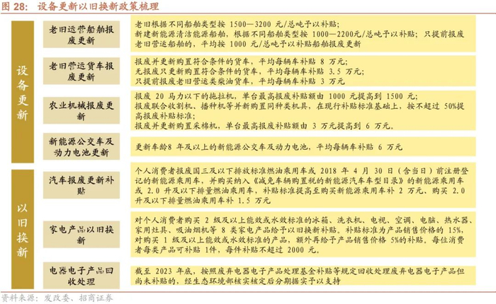 汽车以旧换新方面,相较于加码前《汽车以旧换新补贴实施细则》的部署,本轮政策翻倍了乘用车补贴,新增了老旧柴油货车的报废更新。假设本次中央支持资金在 375-500 亿元左右,按 9:1 的央地出资比例,按照 2009 年1:8 的撬动比划定区间做敏感性分析,撬动资金可达 2000 亿元以上。进一步假设其中 20%-40%为新增消费,则对应约 400-1200 亿元的增量汽车消费。从细分行业来看,建议重点关注重卡更新需求。今年的商用车的需求相对偏重于卡车,其中轻卡和重卡的需求较高,此次政策主为拉动重卡更新,给予平均 8 万元补贴,补贴力度大,营运类柴油货车更新为天然气货车具有较大更新潜力。