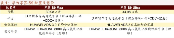 华为享界 S9 共发售两种车型,享界 S9 Max 定价为 39.98 万元,享界 S9 Ultra 定价为 44.98 万元。华为享界 S9采用“OneBox”设计,完美平衡了大空间、高效率与高颜值。值得一提的是,享界 S9 首创了轿车后排零重力座椅、车规级投影巨幕,并搭载了 D 级轿车专属的途灵平台,以及首发 HUAWEI ADS 3.0 高阶智能驾驶系统。