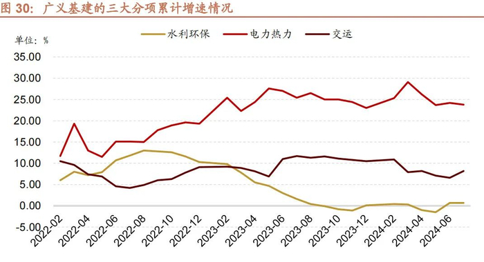 截至 7 月,广义基建投资三大分项中,电力热力投资表现较好,累计增速达到了 23.8%。